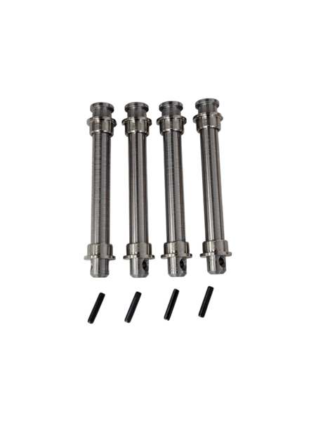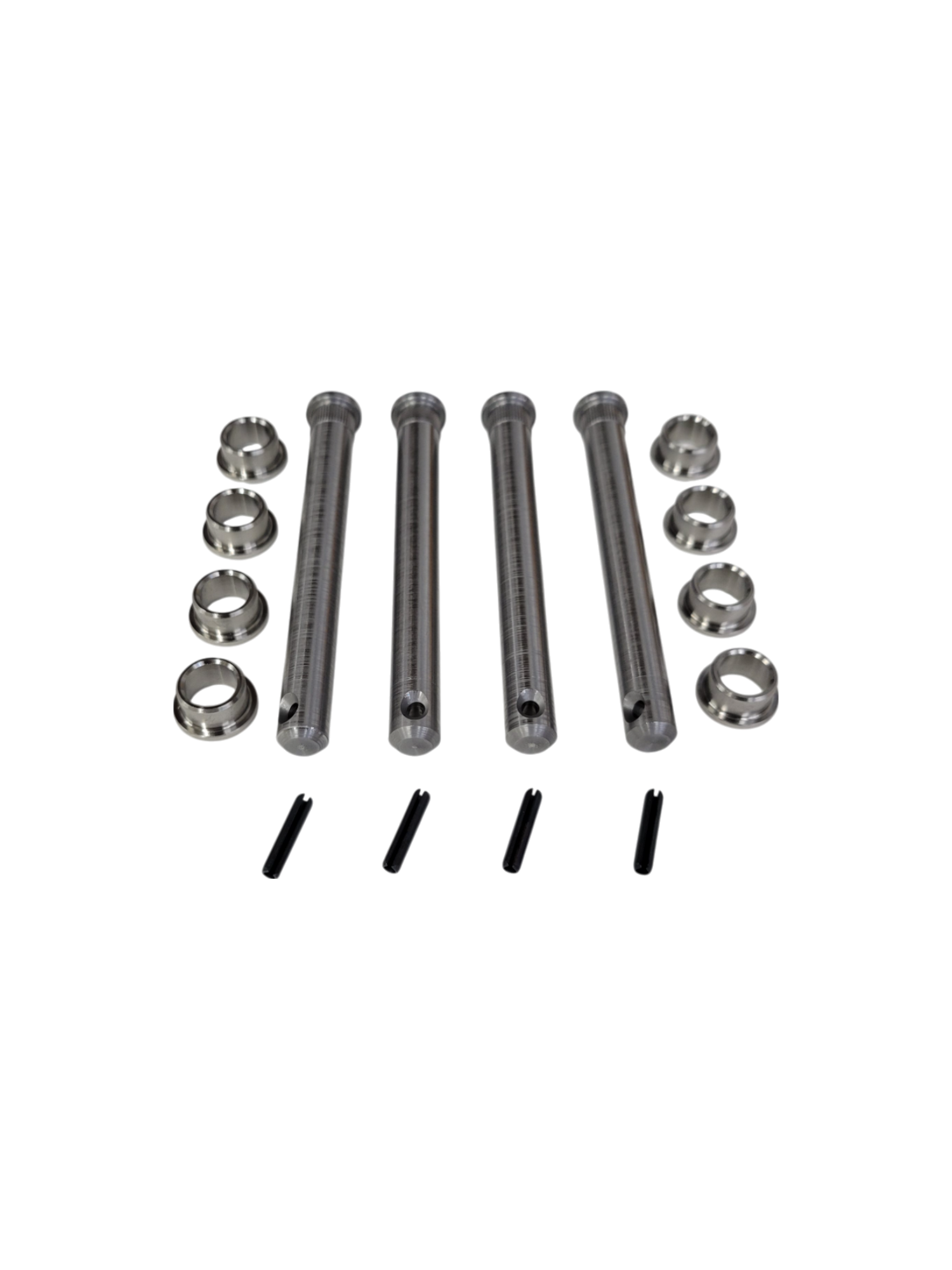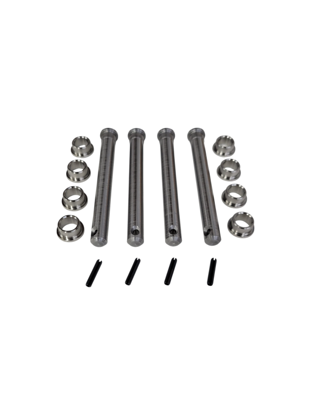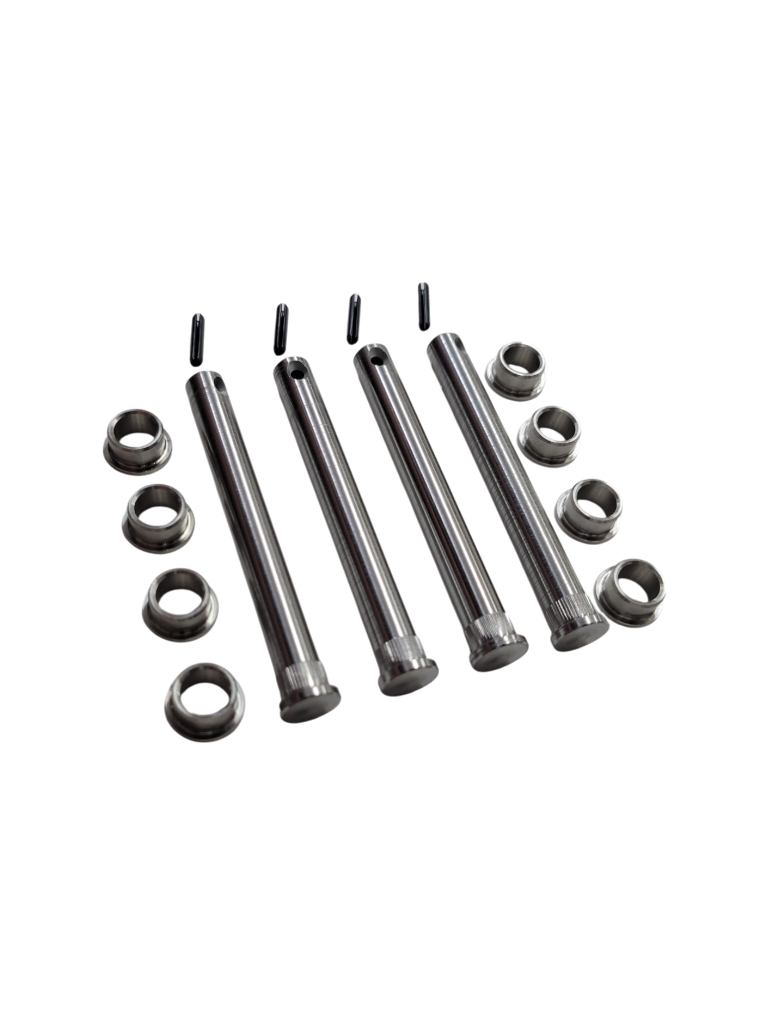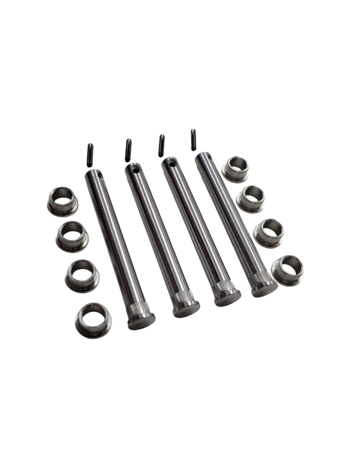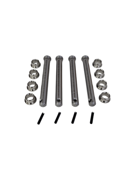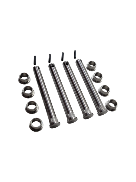 Now introducing the Grand Cherokee Pin and Bushing Replacement Kit. These pins and bushings are made from abrasive-resistant and strong stainless steels typically used in aerospace and heavy industry. Designed to outlast your vehicle while taking all the abuse you can throw at them. They eliminate door sag and will not wear out. These door pins are capable of handling custom doors that have heavy speakers or other equipment in them.